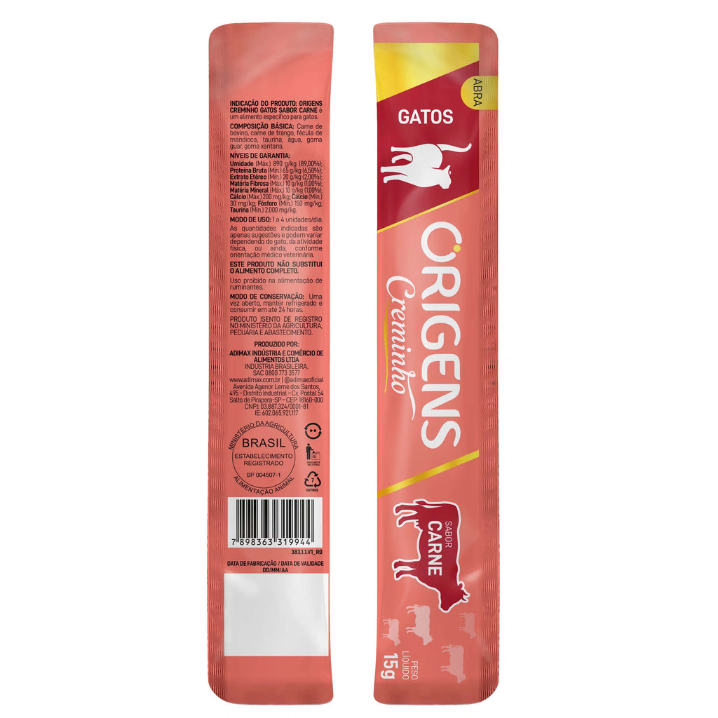 O Petisco Cremoso Origens Creminho Carne para Gatos é a combinação perfeita de sabor e nutrição. Feito com ingredientes de alta qualidade, este petisco oferece uma textura cremosa e deliciosa que agrada até os felinos mais exigentes. Ideal para ser servido como agrado entre as refeições ou para reforçar o vínculo com o seu pet. Rico em proteínas essenciais, auxilia na saúde e vitalidade do seu gato, proporcionando uma experiência única de sabor a cada porção. O momento de cuidar do seu gato agora é ainda mais gostoso!
